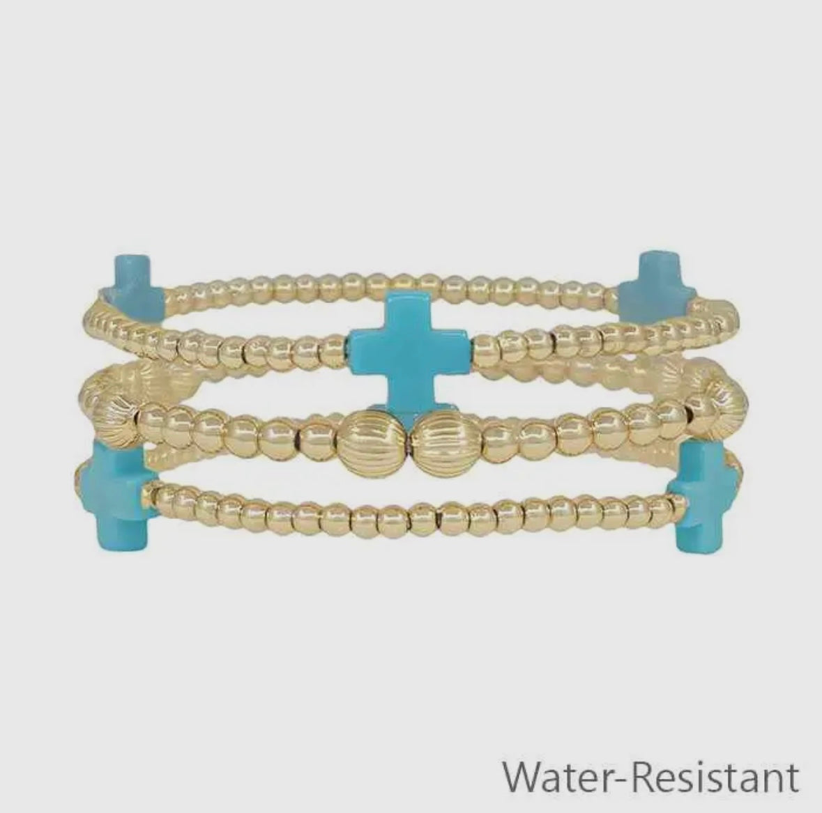 This gold beaded bracelet stack features soft turquoise cross accents for a timeless, faith-filled look. Perfect for everyday wear, these stretchy bracelets are lightweight, comfortable, and easy to style alone or layered with your favorites. A beautiful reminder to walk by faith wherever you go.