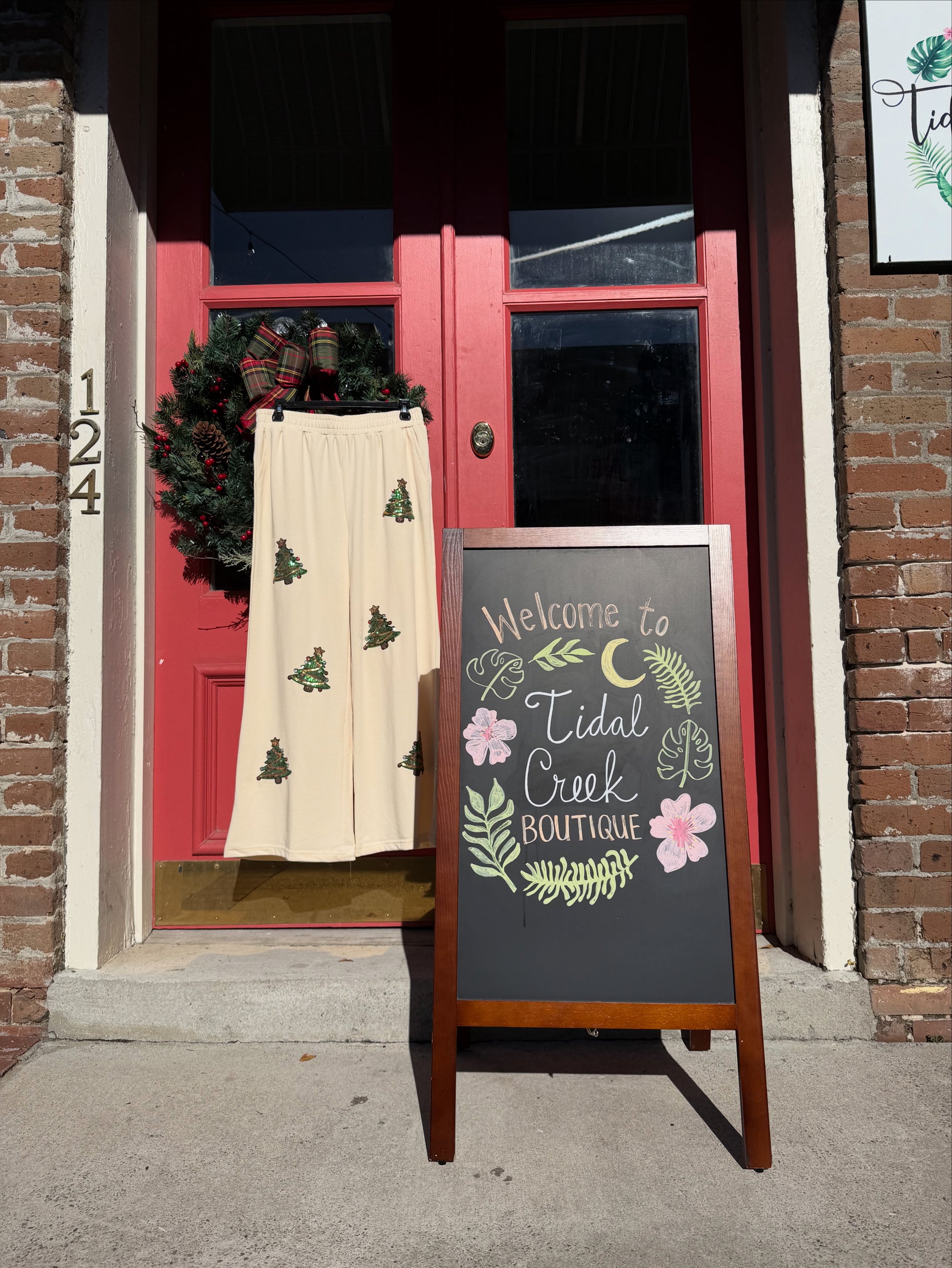 Meet your new holiday uniform. These cream lounge pants feature tiny embroidered Christmas trees and the softest, coziest stretch fabric. Perfect for movie nights, pajama parties, wrapping gifts, or sipping cocoa by the tree. Cute and comfy? Say less.