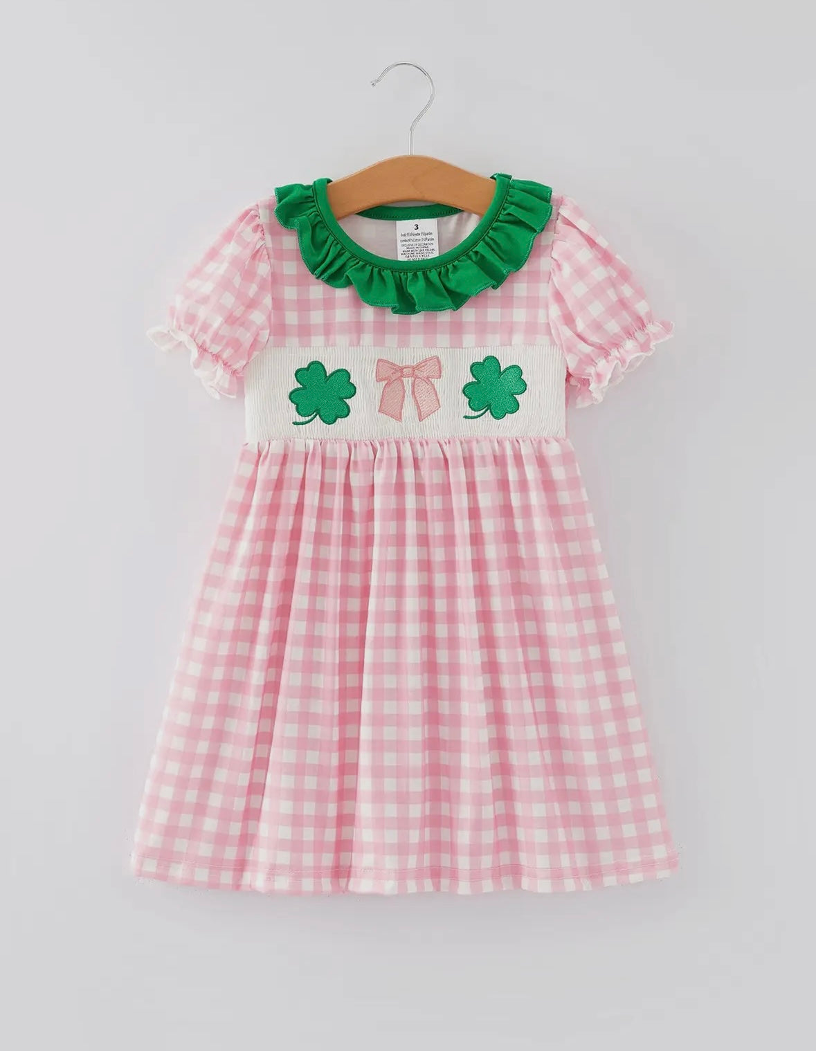 St. Patrick's Day Smocking 4-leaf Clover Plaid Bow Embroidered Dress
