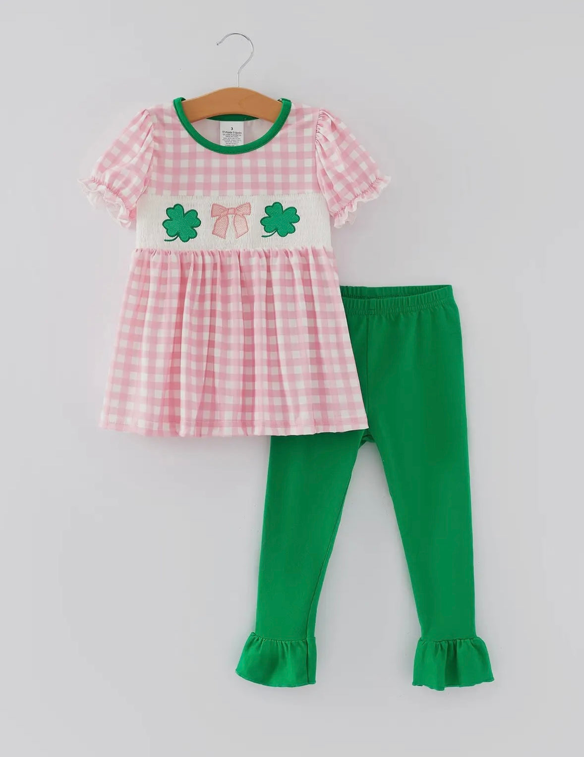 St. Patrick's Day Smocking 4-leaf Clover Plaid Bow Embroidered Set
