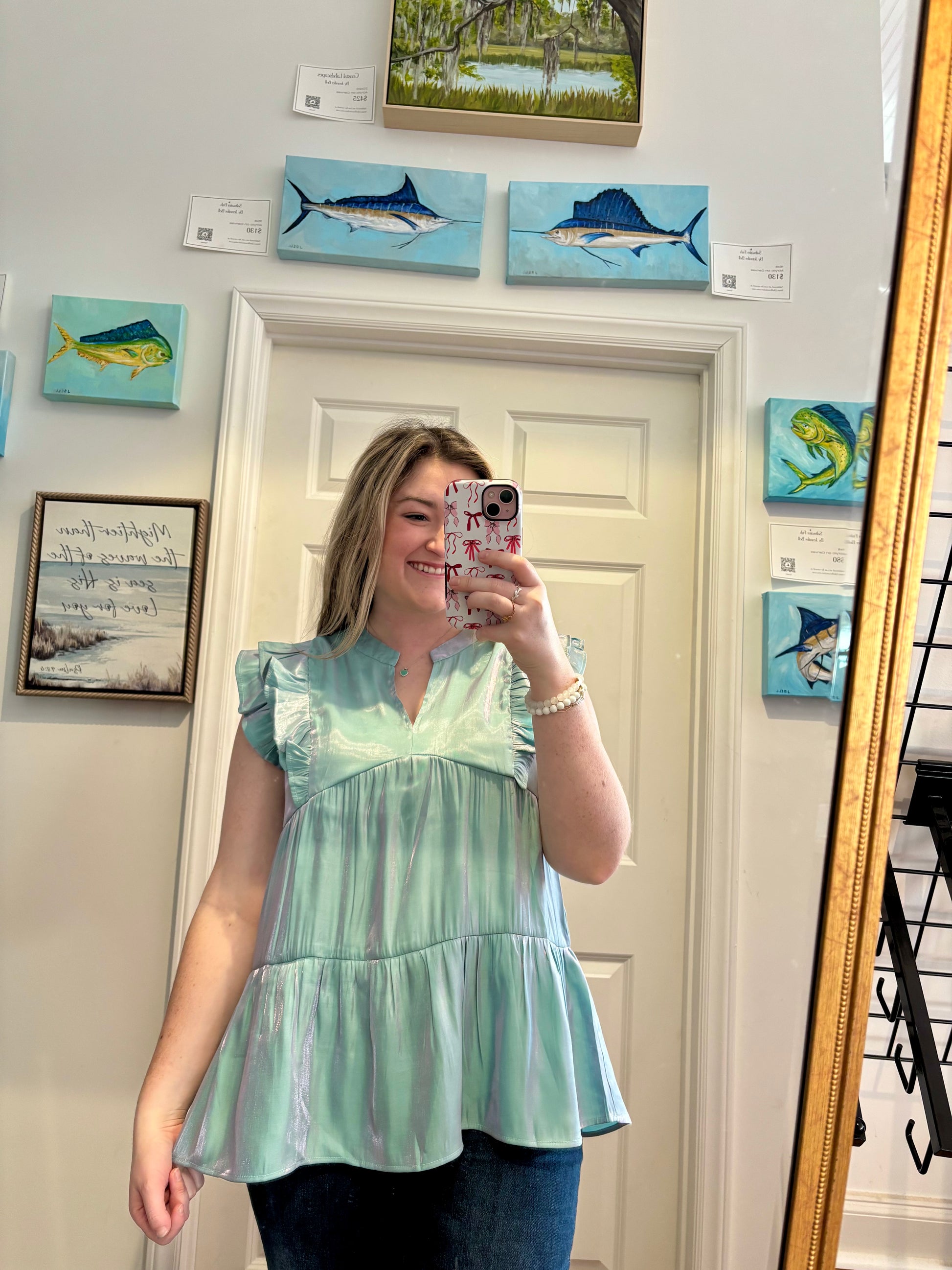 The Seafoam Serenity Babydoll Top is effortlessly feminine with a coastal touch 💚 Featuring a soft V-neckline, flutter ruffle sleeves, and a flowy babydoll silhouette that’s both flattering and comfortable. The lightweight fabric has a subtle sheen that catches the light beautifully, making it perfect for everyday wear or dressing up.