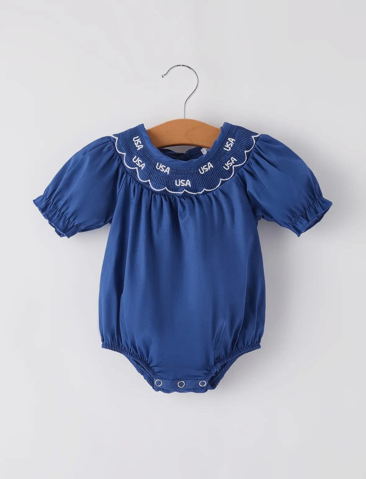 Our Sweet Land of Liberty Bubble features the same rich blue fabric with “USA” embroidered smocking and darling puff sleeves for a classic, picture-perfect outfit.